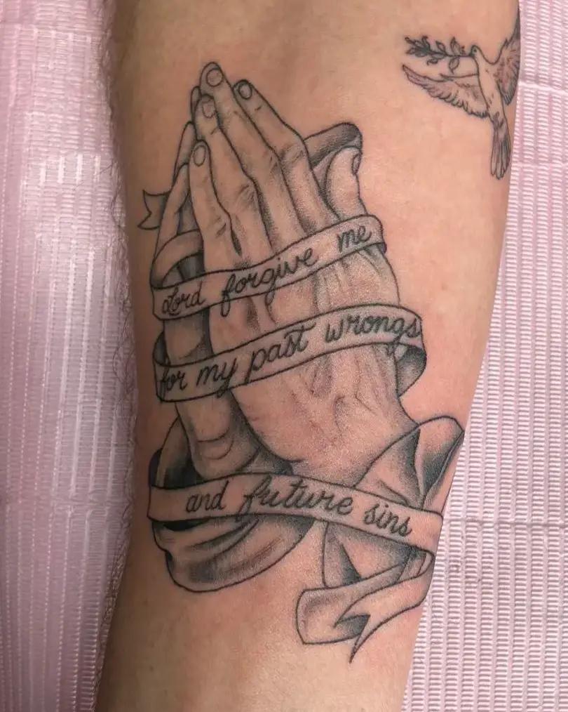 A highly detailed black and grey realism tattoo featuring praying hands wrapped in a scroll inscribed with the powerful phrase: "Lord forgive me for my past wrongs and future sins." This meaningful piece uses deep shading to convey realistic texture, symbolizing faith, repentance, and spiritual devotion.